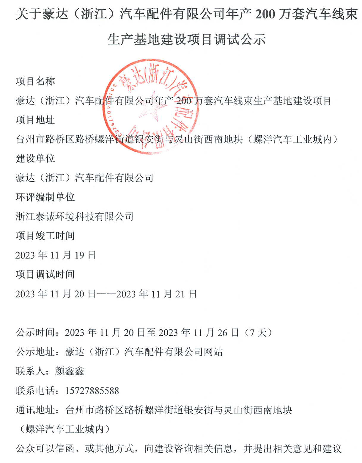 关于豪达(浙江)汽车配件有限公司年产200万套汽车线束生产基地建设项目调试公示